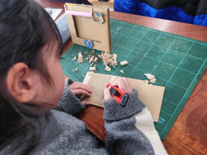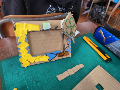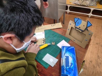 図画工作科の時間は、段ボールを材料にして、自分だけのフォトフレームを作っています。