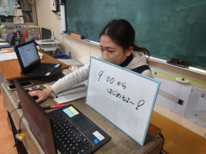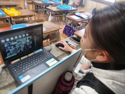 昨日から学級休業となっているクラスで、教室と各家庭を結んでオンライン朝の会を行っています。