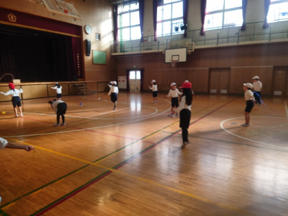 体育科の時間は、みんなでなわとびの練習をしています。