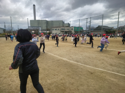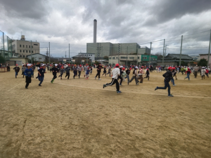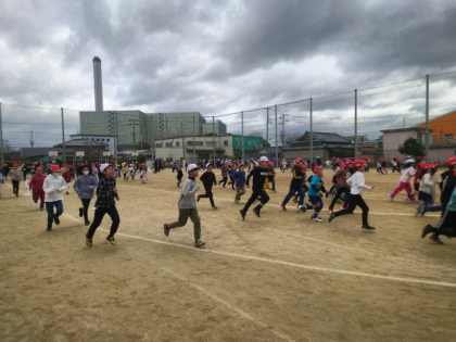 運動場で、子どもたちが元気に5分間走をしています。
