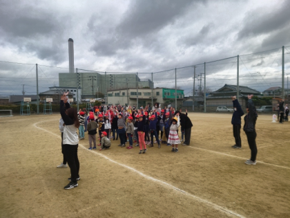 運動場で、子どもたちが元気に5分間走をしています。