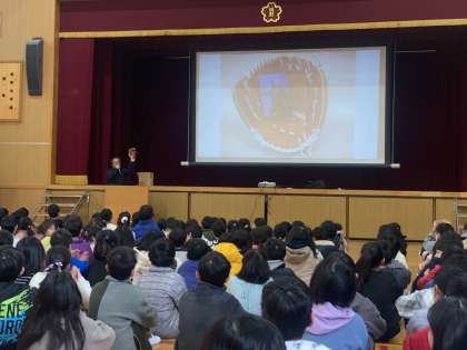 校長講話では、まず初めに大谷選手から届いたグローブを紹介しました。