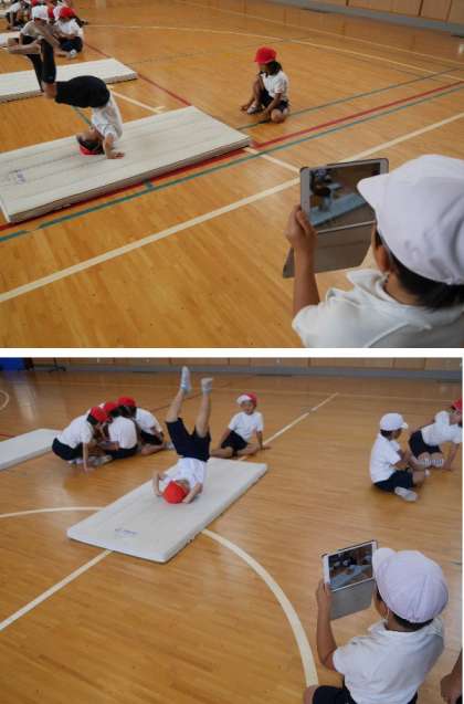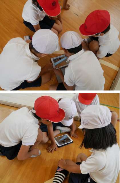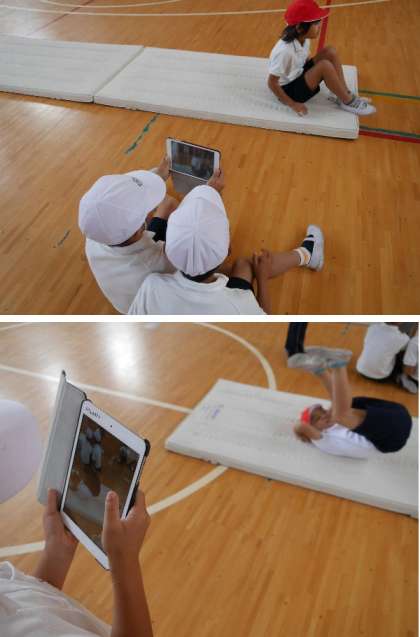 2年生の体育の授業はマット運動です。今日はタブレットをもって友だちのマット運動を録画しています。それを皆でみなおしています。はじめて使うタブレットですが、上手につかっていました。