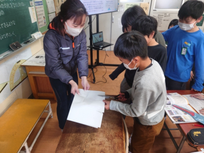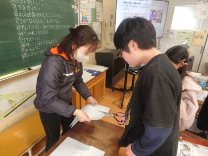 授業の終わりに、包丁づくりの技術でつくられたはさみで紙を切る体験をしました。