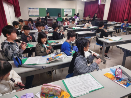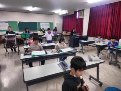 音楽科の時間は、リコーダーや太鼓、木琴などの楽器を使って「パフ」の合奏の練習をしました。