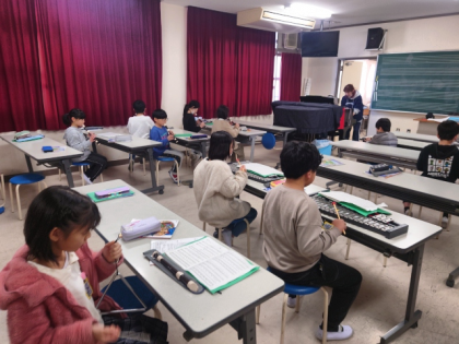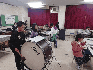 音楽科の時間は、リコーダーや太鼓、木琴などの楽器を使って「パフ」の合奏の練習をしました。