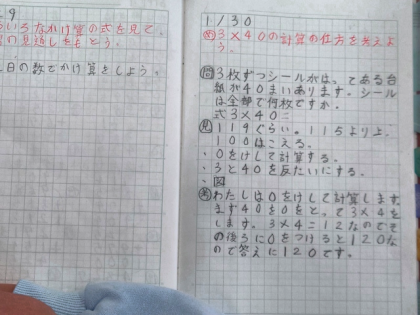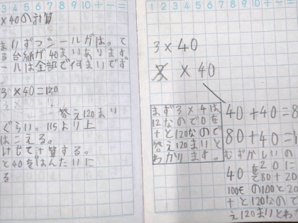 3×40の計算の仕方をノートに書いて考えています。