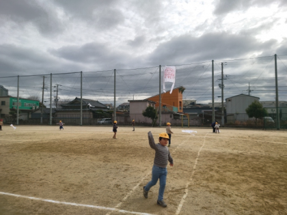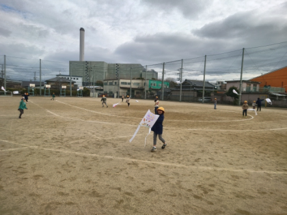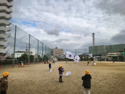 生活科の時間は、自分たちが作ったビニールカイトを運動場で飛ばしました。