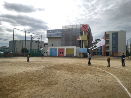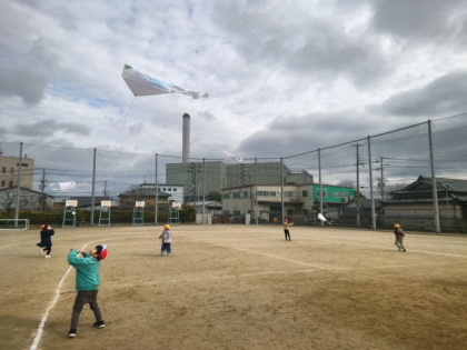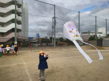 生活科の時間は、自分たちが作ったビニールカイトを運動場で飛ばしました。