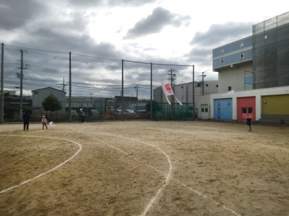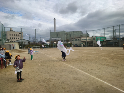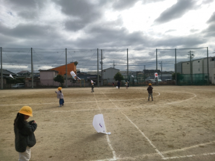 生活科の時間は、自分たちが作ったビニールカイトを運動場で飛ばしました。