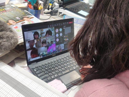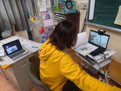 発熱や感染症による臨時休業となったクラスで、教室と各家庭を結んでオンライン朝の会や学習を行っています。