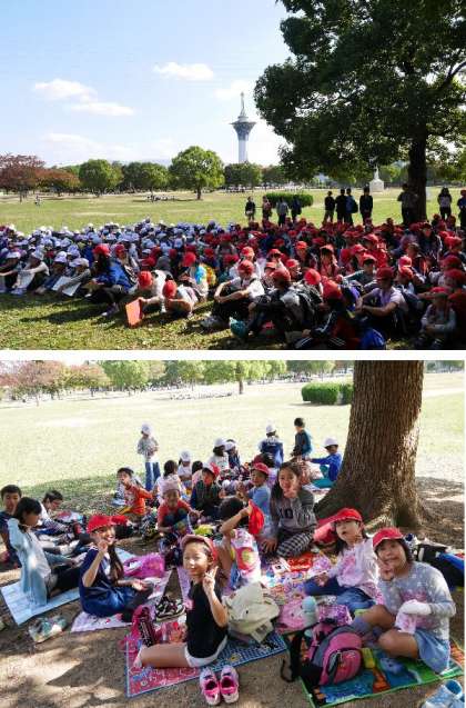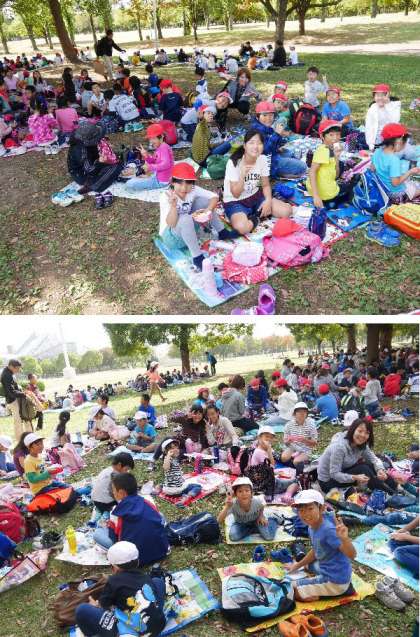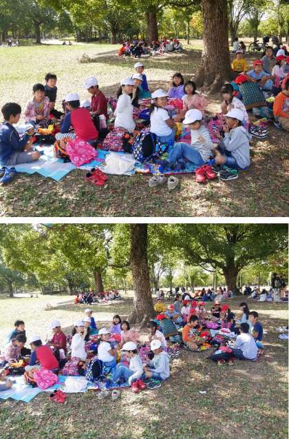 全校児童が鶴見緑地の大芝生に集合しました。たてわり班に分かれておいしいお弁当をいただきました。とってもいい顔です。6年生から1年生まで仲良くおしゃべりしながらいただきました。