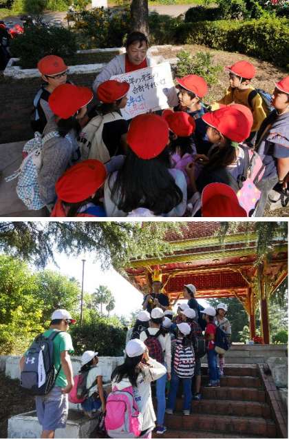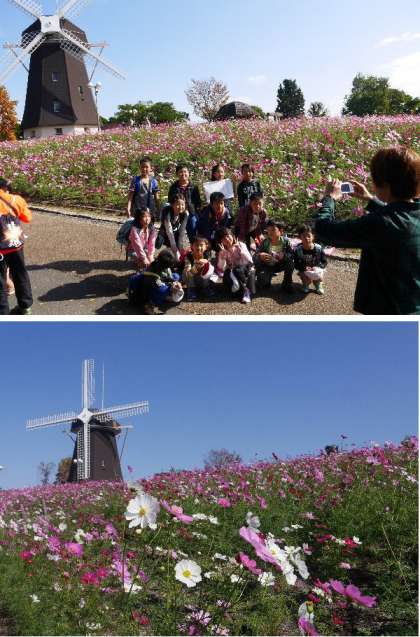 たてわり班でポイントを探して動きます。風車のポイントでは写真をとってもらいました。花がさいてとてもきれいです。空も真っ青でとても気持ちのいい天候でした。