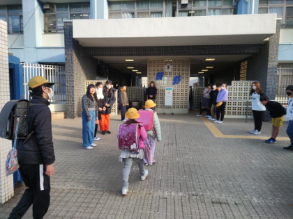 運営委員会の子どもたちと一緒に、教職員も自分から元気よくあいさつした子どもたちに「葉っぱ」を渡します。