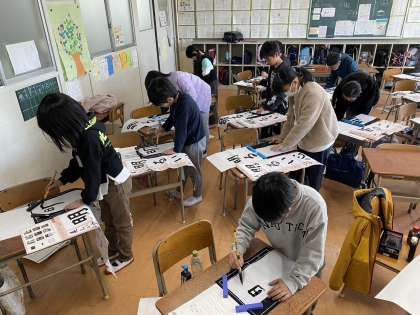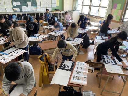 書写の時間は、毛筆で「明るい心」の字を書きました。