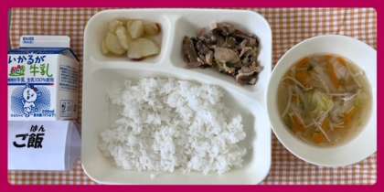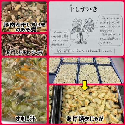 今日の献立は、豚肉と干しずいきのみそ煮・すまし汁・あげ焼きじゃが・ごはん・牛乳でした。