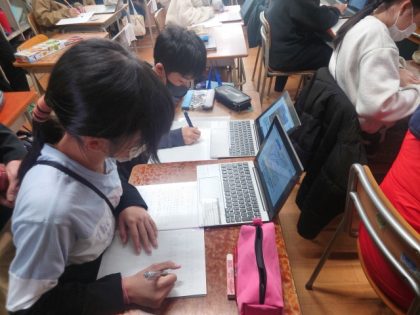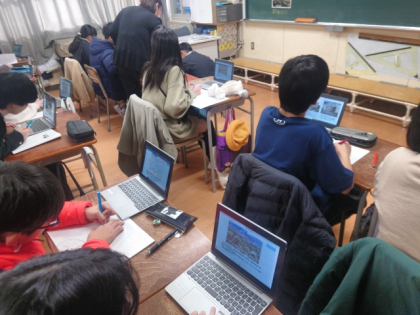 「オリンピックに向けた国内の動きはどのようなものだったのか」という問いをもとに、子どもたちは「新幹線の開通」「高速道路の建設」「モノレールや地下鉄の新しい路線の開通」「ホテル・競技施設の建設」「3C(カラーテレビ・クーラー・自家用車)の普及」「道路や下水道の整備」「重化学コンビナートの建設」「港の整備」など、当時の日本が取り組んだことや、新たに生まれたものについて1人1台PCで配付した資料で調べました。