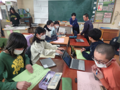 今、子どもたちは「戦争と人びとのくらし」の学習で学んだことを、グループで相談しながらテーマ別にまとめています。