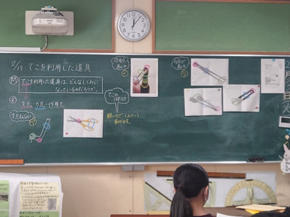 理科の時間は、てこを利用した道具はどんなしくみになっているのか、はさみやせんぬき、ピンセット、パンばさみなどをもとにグループで考えました。