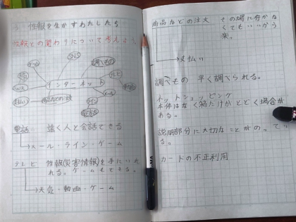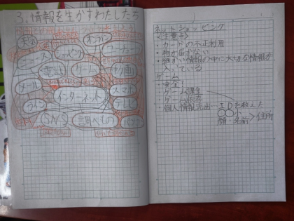 個人情報の流失、オンラインゲームによる高額課金、インターネットショッピングのにせサイトなど、教科書や動画を見ながらインターネットの利用で起こる問題について学習しました。