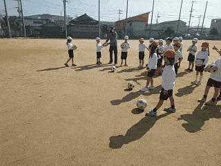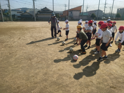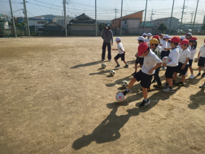 体育科の時間は、運動場でボールをける運動の学習をしています。