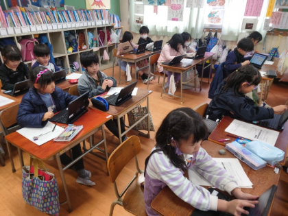 学習用端末のプログラミングアプリ「Scratch」を使って、キャラクターを動かすプログラムを作っています。