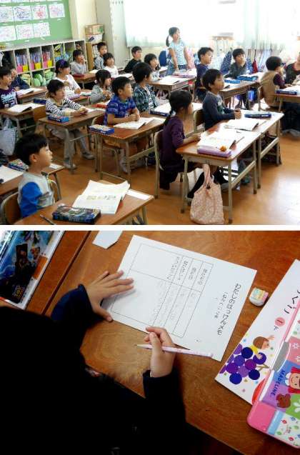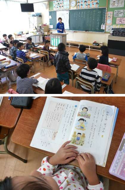 1年生の国語の授業です。「わたしのはっけん」を読んで、身の回りの花や木、生き物などの様子を文章に書いて友だちに伝えます。