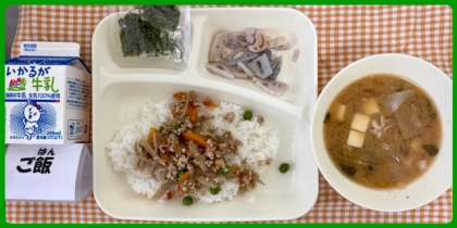 今日の献立は、鶏ごぼうご飯・みそ汁・焼きれんこん・牛乳でした。