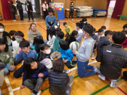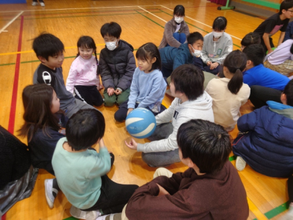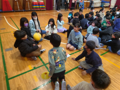 ゲームのルールは、集会委員が「ごろごろ」と言っている間に班でボールをまわし、「ドカン」と言ったときにボールを持っていた人が「今年の感謝の気持ち」を班のみんなに伝える、というもの。