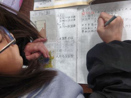 子どもたちは、関市長の取り組みの中から「すごい」と思うことを副読本から読み取って、ノートにまとめていきました。