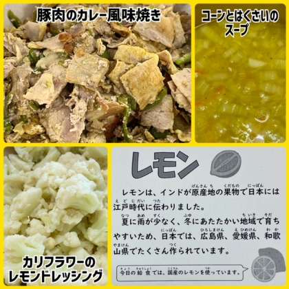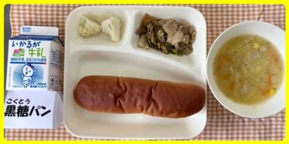 今日の献立は、豚肉のカレー風味焼き・コーンとはくさいのスープ・カリフラワーのレモンドレッシング・黒糖パン・牛乳でした。