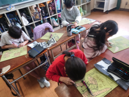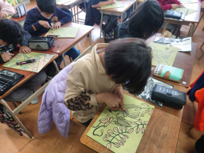 4年生が初めて彫刻刀をつかって版画の作品を制作しています。