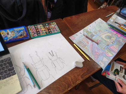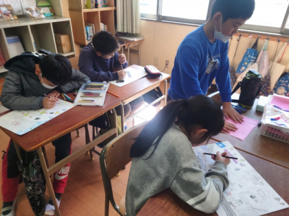 今日は、思い思いのデザインをもとに下描きを描き、絵の具やパス、色えんぴつで着色しています。