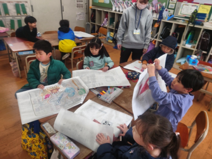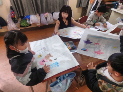 1年間の作品を入れて持って帰る「作品袋」に思い思いの絵を描いています。