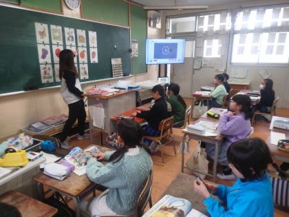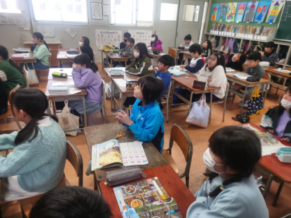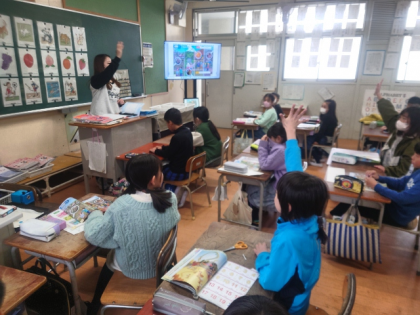 英語活動の時間は、動物、くだもの、スポーツの言葉を表す英語の表現を知り、"What's this?""It's〜"の表現を使って、絵が何を表しているかを伝えるやりとりを練習しました。
