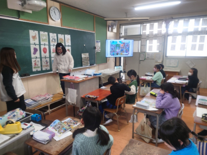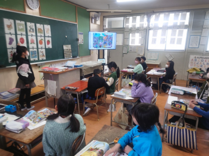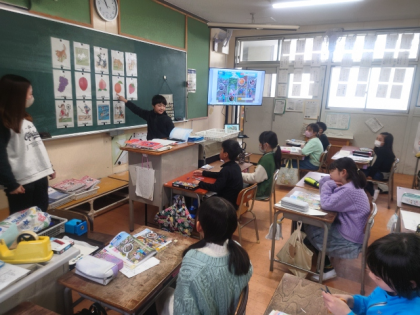 英語活動の時間は、動物、くだもの、スポーツの言葉を表す英語の表現を知り、"What's this?""It's〜"の表現を使って、絵が何を表しているかを伝えるやりとりを練習しました。