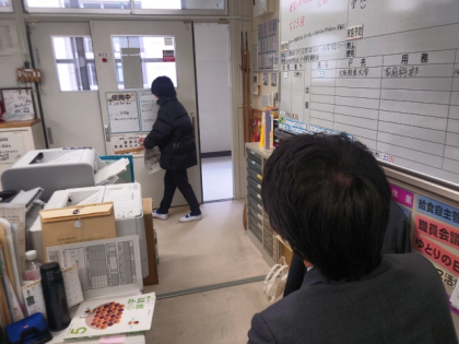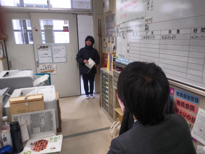 健康委員会の子どもたちが、3月の「保健目標」を知らせるために、職員室に掲示物を届けにきました。