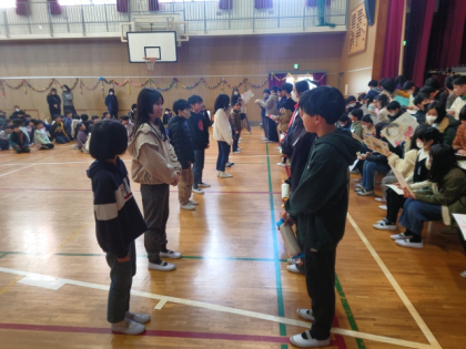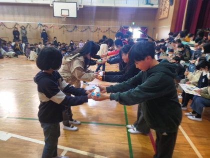 今度は、6年生から在校生のみんなに、手作りのぞうきんが贈られました。
