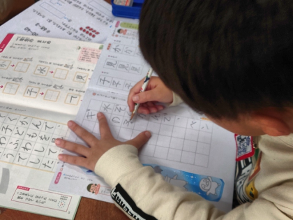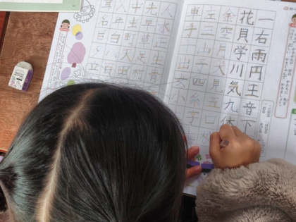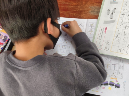 姿勢よく、ゆっくりていねいに、字の練習をしています。