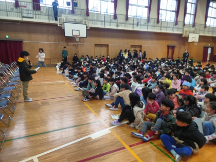今朝の児童朝会は、全校児童が講堂に集まって行いました。