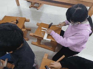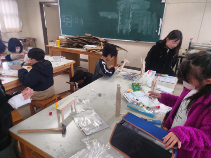 図工科の時間には、木切れを組み合わせ、くぎ打ちをして作品を作ります。