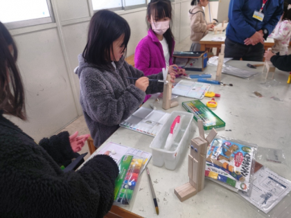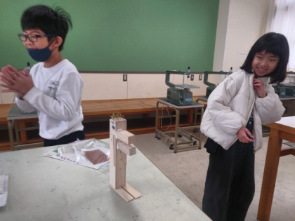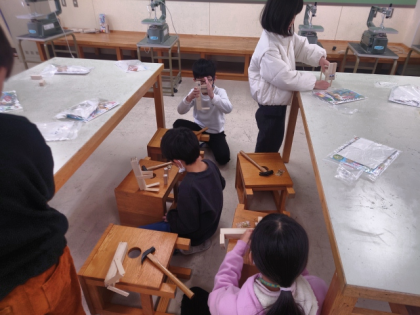 図工科の時間には、木切れを組み合わせ、くぎ打ちをして作品を作ります。