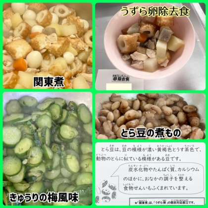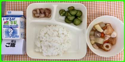 今日の献立は、関東煮・きゅうりの梅風味・とら豆の煮もの・ごはん・牛乳でした。