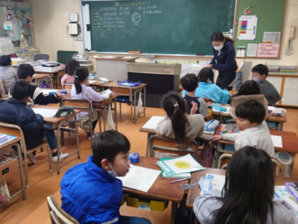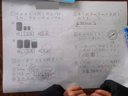 算数科の時間は、かさや長さ、時間と時刻などの学習の復習問題をみんなで考えています。