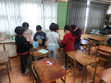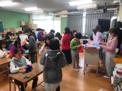 昼休みに、自分から進んで集まった3年生から5年生の子どもたちが、お花紙でお花を作っています。