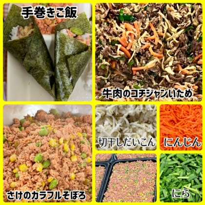 献立は、手巻きご飯(牛肉のコチジャンいため・さけのカラフルそぼろ) ・すまし汁・ダイスゼリー(みかん)・牛乳です。