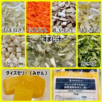 「すまし汁」は、とうふ・はくさい・たまねぎ・たけのこ・しいたけ・みつばを使用した和風の汁物です。