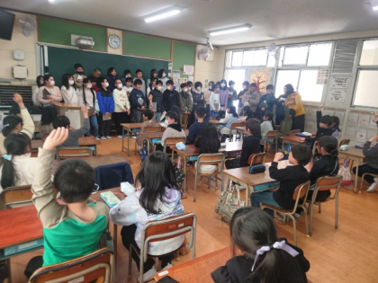 2年生の教室で、2年生と6年生が一緒に勉強しています。