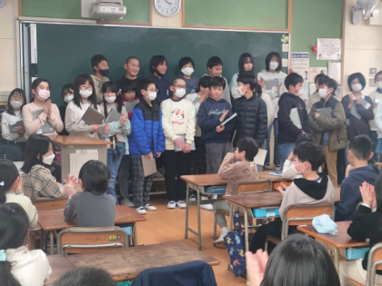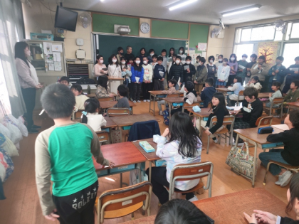 2年生の教室で、2年生と6年生が一緒に勉強しています。