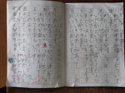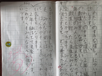 国語科の時間は、自分のお気に入りの場所について「好きな場所」「好きなわけ」「好きな場所で何をするか」など伝えたいことを書き出して整理し、構成を考えてみんなに話す文章を書きました。